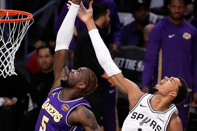 不仅如此,今天在防守端,东契奇也是异常卖力。不过下半场,风云突变,倒不是两队哪一方爆发,而是裁判发力,连续吹罚湖人队犯规,单节16-2的罚球差,让湖人球迷直呼难绷。不过,出乎意料的是,即便如此湖人也没有崩盘。一直到末节,两队的比分都很胶着。所以两队的对抗愈发强烈,裁判的腮帮子都快吹炸了。前面八村塁被文班亚马单节连续造了三次犯规,很快,八村塁又造了文班亚马第六次犯规,后者犯满下场。这么一来,马刺队的索汉、文班亚马、巴恩斯全部被罚出场,这是马刺队28年来头一次单场3人被罚出场。