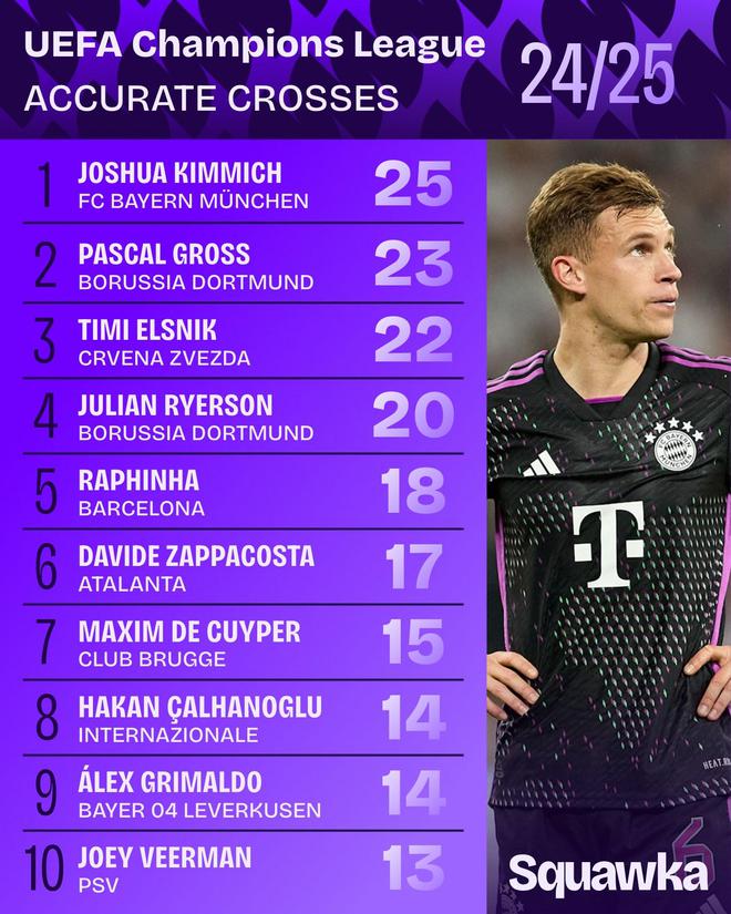 24/25赛季欧冠精准传中榜:基米希25次居首,格罗斯23次列第二